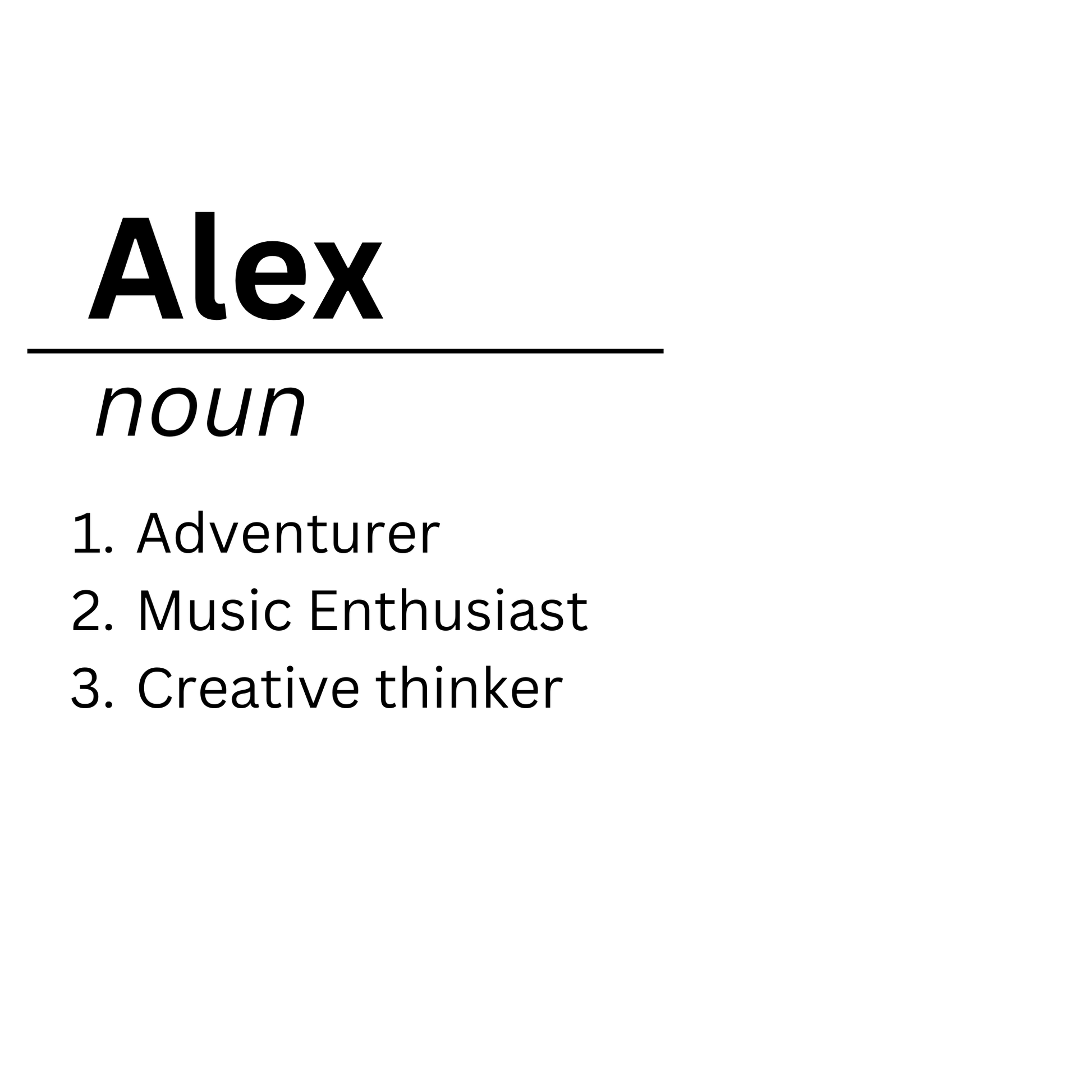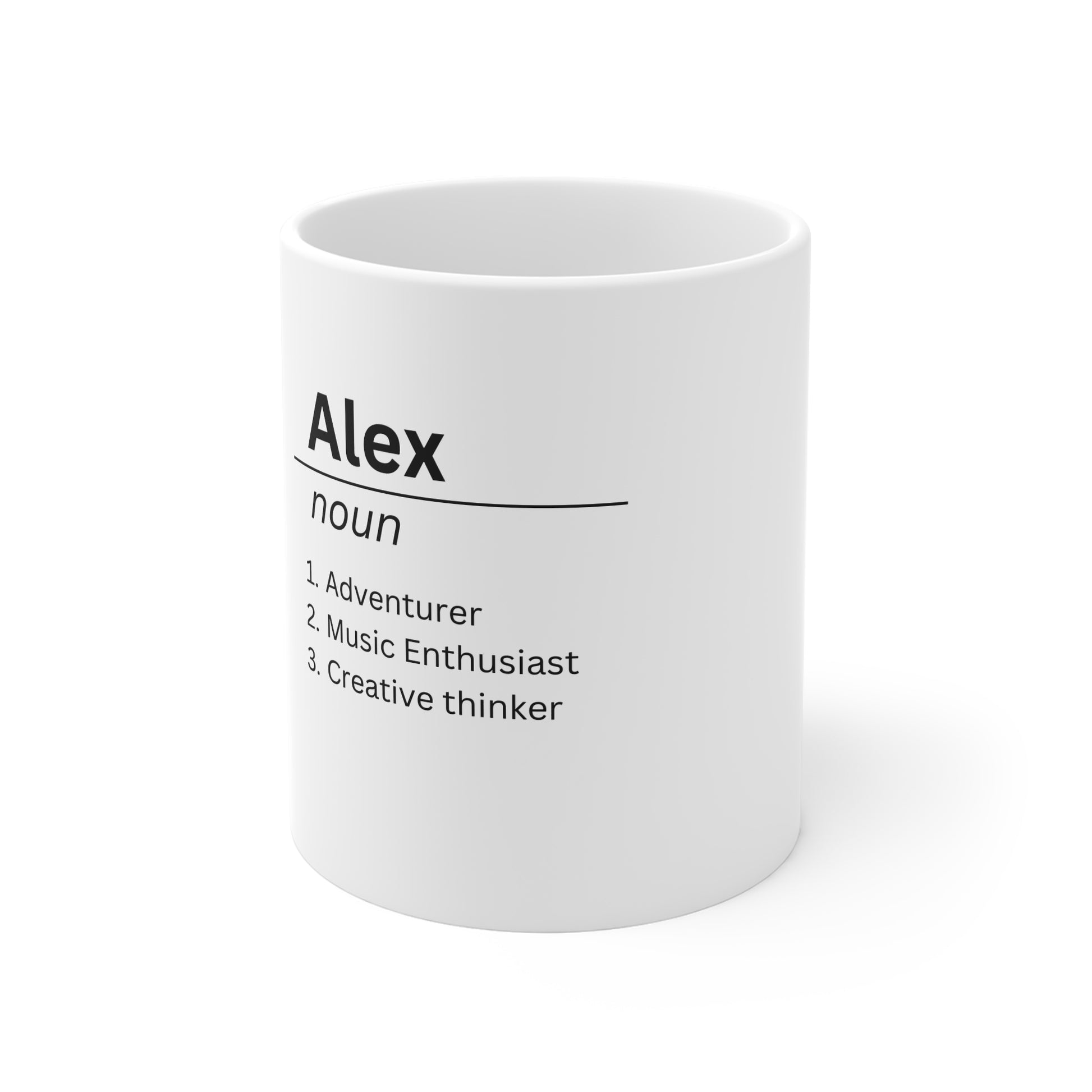 A bold, modern mug that turns a name into a personal statement. Clean black typography on bright white ceramic presents a name alongside three defining traits — adventurer, music enthusiast, creative thinker — creating a thoughtful gift that celebrates what makes someone unique.